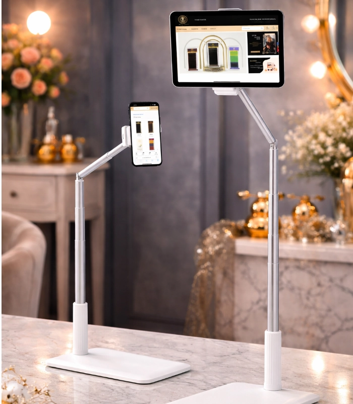 Designul elegant și compact face ca acest suport profesional pentru telefon și tabletă să se integreze perfect în orice spațiu de lucru. Poți utiliza suportul fără a ocupa mult loc atunci când este depozitat. Este alegerea ideală pentru cei care își doresc conținut stabil, bine luminat și de înaltă calitate, fără efort.